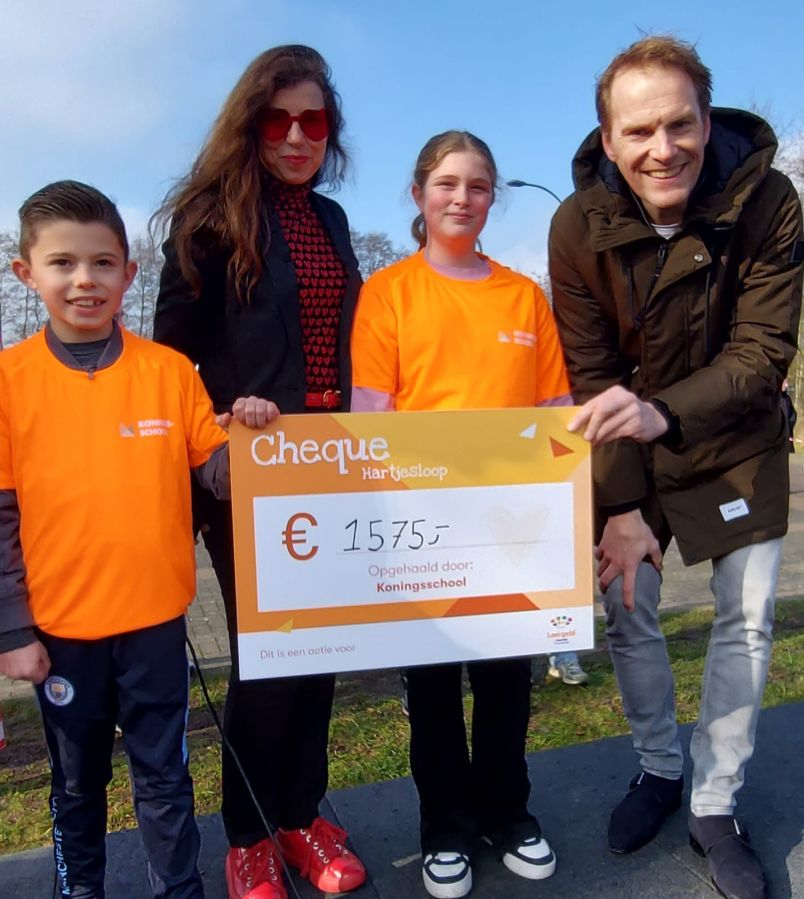 Maar liefst € 1.575,- liepen de leerlingen van de Koningsschool tijdens hun sponsorloop bij elkaar voor Leergeld Waalwijk. Ook twee andere goede doelen, Villa Pardoes en Stichting De Kinderen, ontvingen eenzelfde bedrag. Namens onze stichting nam Geert de cheque in ontvangst van leerlingen Evi en Edin en directeur Marcia. Hij bedankte de leerlingen voor hun sportieve inzet en het organiseren van deze Sponsorloop. Dankjewel Koningsschool voor deze geweldige actie!